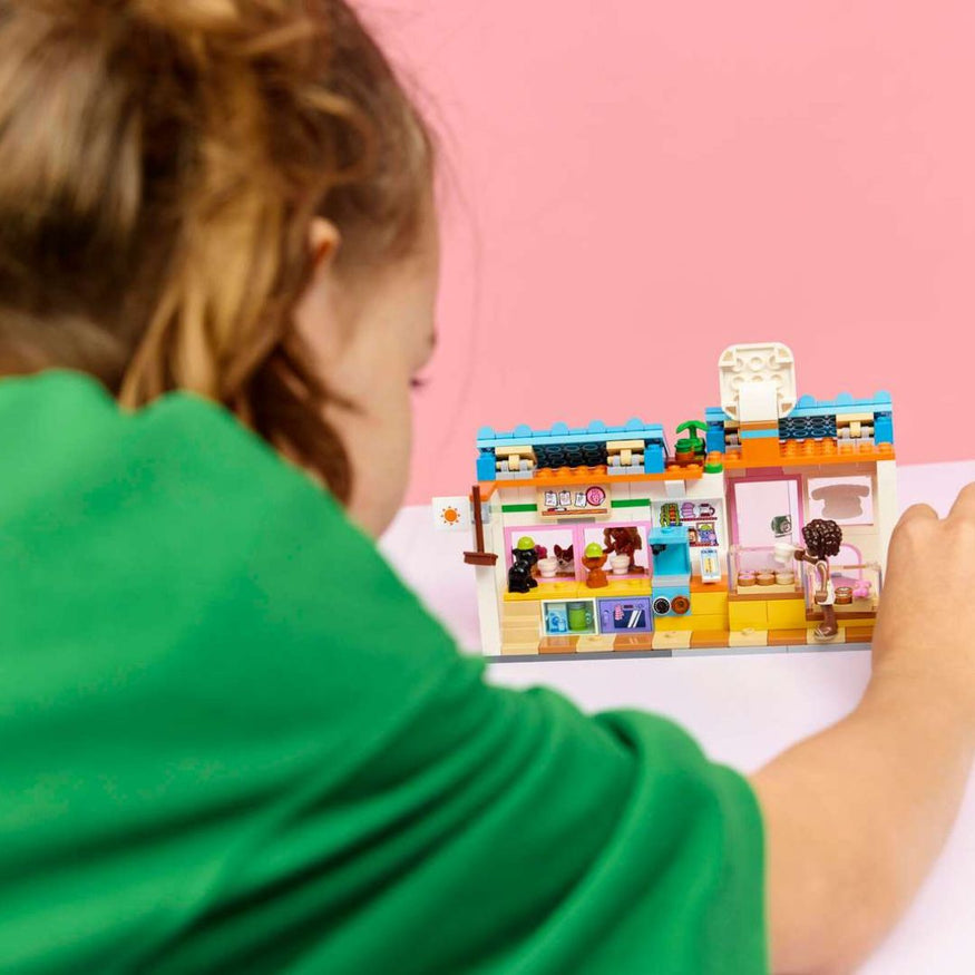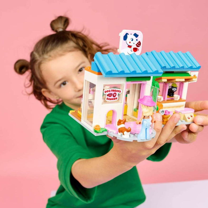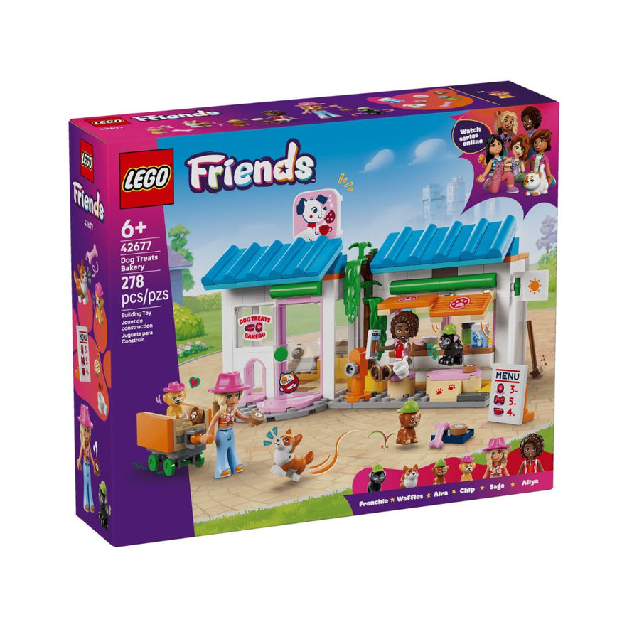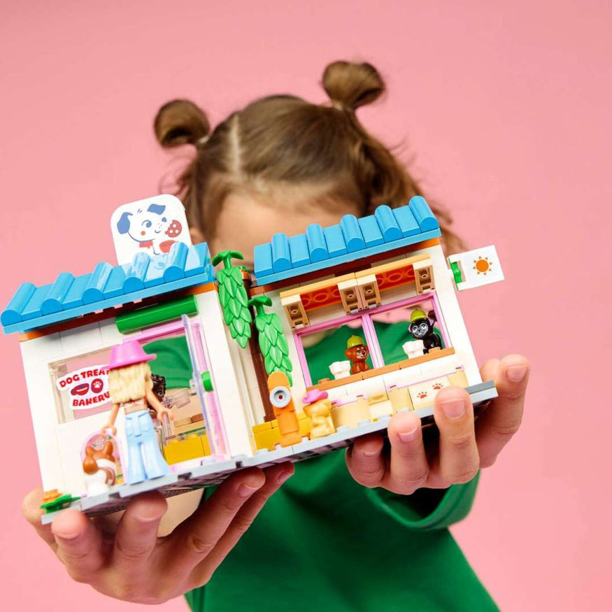 Welcome to the pup-tastic Dog Treats Bakery! This LEGO Friends set (42677) is perfect for kids ages 6+ who dream of opening their own furry-friendly bakery. Bake, serve, and play with Aliya and Sage as they whip up delicious treats for four adorable toy dogs. The bakery is loaded with fun surprises—a working oven, coffee machine, fridge, and even a special ramp so the pups can help serve customers! You'll find everything you need: donuts, cookies, dog treats, bones, cups, hats, and more. Plus, there's a cozy seating area, pet carrier, and pet door to keep the fun going. With 278 colorful pieces, this set sparks endless imaginative play. Use the LEGO Builder app to follow along with easy instructions, save your progress, and rotate your creation in 3D. Perfect for animal lovers and pretend-play enthusiasts—whether it's a birthday surprise or just because!