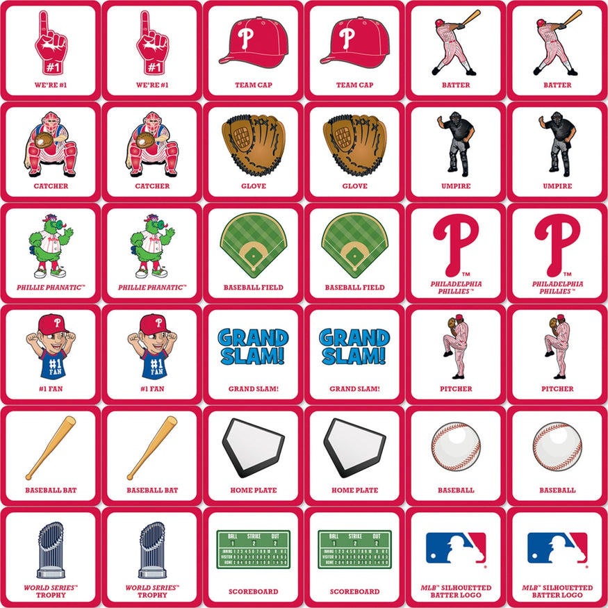 Test your memory with the MLB Philadelphia Phillies Matching Game. This officially licensed game features 18 unique pairs of sports-themed cards printed on premium stock for durability. Perfect for family game nights, it combines the classic matching game format with Phillies pride. Suitable for children and adults alike, it's an entertaining way to challenge your recall skills while celebrating your favorite team.