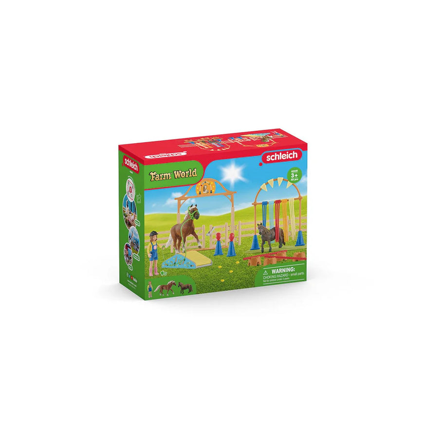 Ready to turn your pony into an agility superstar? This Schleich Farm World set brings the excitement of the competition ring right to your collection! Featuring a spirited Shetland pony and a classic pony, you'll have everything needed to master weaving through cones and jumping cross bars. Watch your miniature equestrians leap, dash, and conquer each obstacle like seasoned champions.