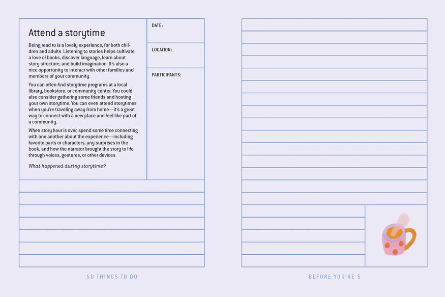 Dive into family fun with the 50 Things to Do Before You're 5 Journal! Packed with playful activities and thoughtful prompts, it inspires young kids and their families to explore, learn, and bond through everyday adventures. From cultural outings to kitchen experiments and nature explorations, this journal transforms simple moments into joyful memories that last a lifetime. Perfect for sparking creativity and connection in little explorers and their grown-ups alike!