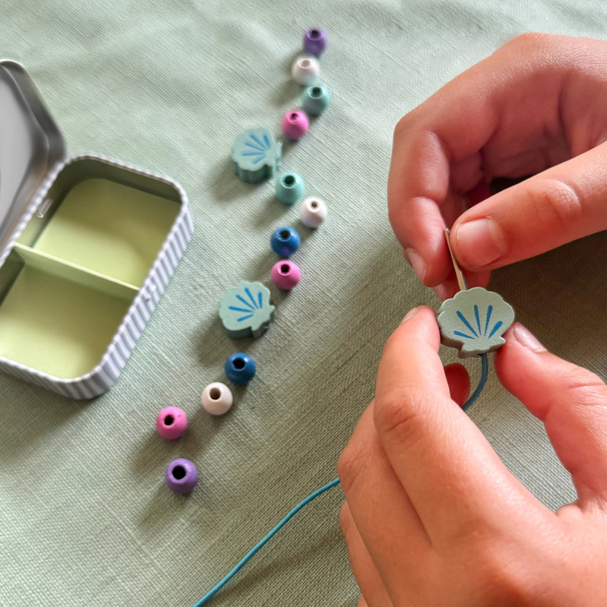 Dive into mermaid magic with this charming bracelet kit! Inside the adorable tin, you'll find wooden beads inspired by ocean treasures and an elastic band with metal ends—everything needed to create a one-of-a-kind bracelet. Once the crafting is done, the tin becomes the perfect hideaway for extra beads, secret treasures, or whatever your little one decides is special enough to keep safe.